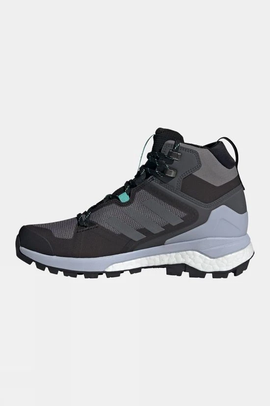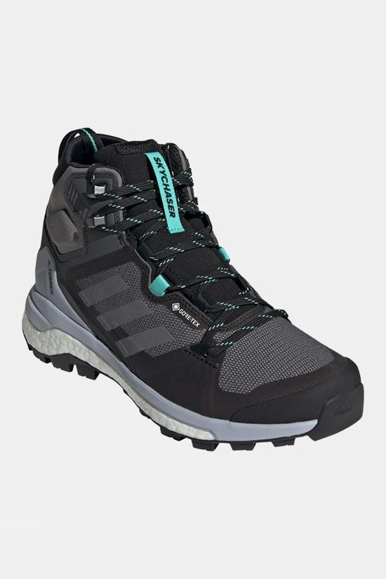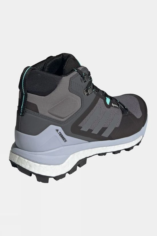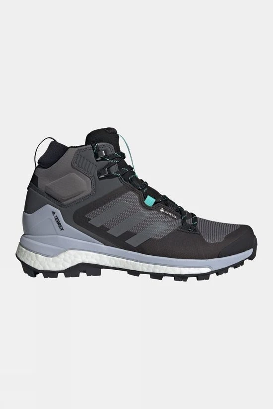 A rugged upper with a waterproof Gore-Tex membrane gives these women’s Terrex Skychaser 2 Mid GTX Boots all-terrain support and all-condition protection. The ankle-height neoprene cuff helps keeps debris on the outside, while Boost technology delivers long-lasting cushioning that works well on uneven ground. A rock protection plate keeps sharp rocks from slowing you down, and the Continental rubber outsole provides a confident grip in slippery conditions.
