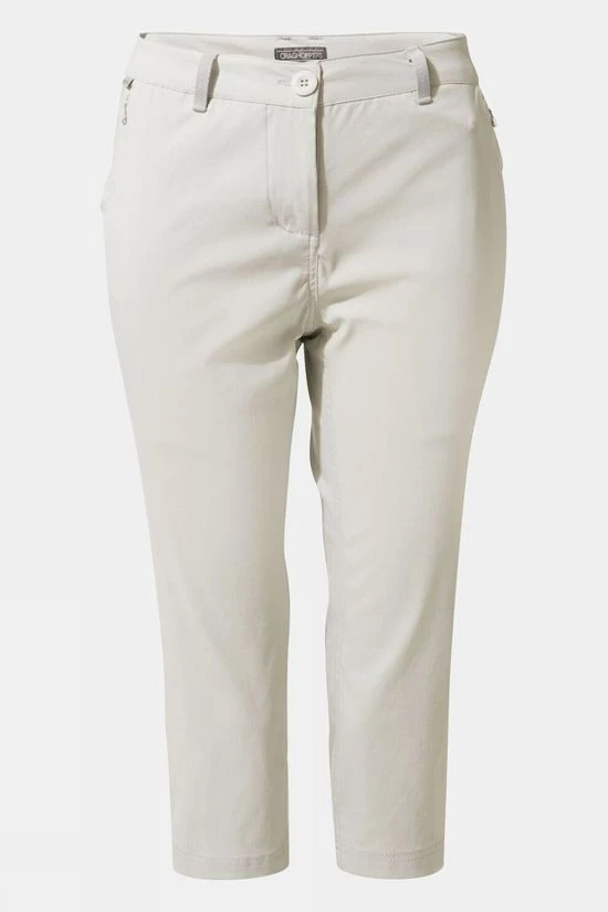 Craghoppers Kiwi Pro II Crop Pants are a spring and summer adventure favourite and are the perfect length for the milder months. The superb sun-protective stretch fabric is insect bite-proof and features EcoShield plant-based water-repellent for splashproof coverage. The pants feature three zipped pockets and a sunglasses wipe for on the go practicality.