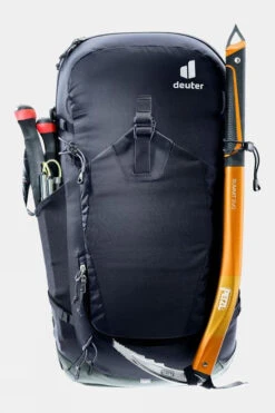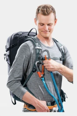 Loops on the shoulder straps keep the carabiners set close at hand. That, combined with the backpack’s compact, snug fit provides enhanced safety when climbing fixed-rope routes. Thanks to a large front zipper opening and elastic front stash pocket, equipment and gear are always readily at hand, yet compactly stowed.