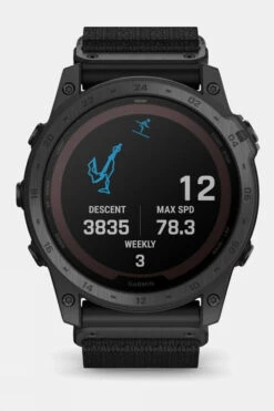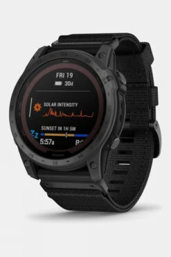 The Garmin Tactix 7 – Pro Solar Edition is a tactical multisport GPS smartwatch featuring a Power Sapphire solar charging lens with traditional button controls and a touchscreen display. Its rugged yet sophisticated design includes an always-on 1.4” solar powered display with sapphire lens, custom front bezel design, black DLC-coated titanium bezel and black PVD-coated titanium rear cover. Tactical-ready features include a dimmable white or green LED flashlight, night vision compatible display, preloaded tactical activity, dual-position GPS formatting, jumpmaster mode, projected waypoints, stealth mode and kill switch. Navigate the harshest environments with elite navigation featuring preloaded TopoActive and ski maps plus multi-band and multi-GNSS support. The tactix 7 – Pro Edition smartwatch also includes advanced training and performance tracking such as endurance and stamina, comprehensive health and wellness monitoring, and everyday functionality with smart notifications1, Garmin Pay contactless payments and more.