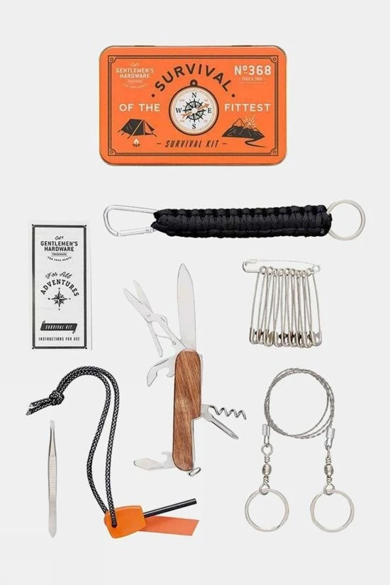 The ultimate outdoor companion! This Gentlemen’s Hardware Survival Kit has all you need for a trip into the wilderness. The handy kit includes a fire starter tool, 6-in-1 penknife tool, tweezers, 210cm rope, 10 safety pins and wire saw. Packaged in a smart branded tin, it is ideal for fitting in a backpack and taking on-the-go.