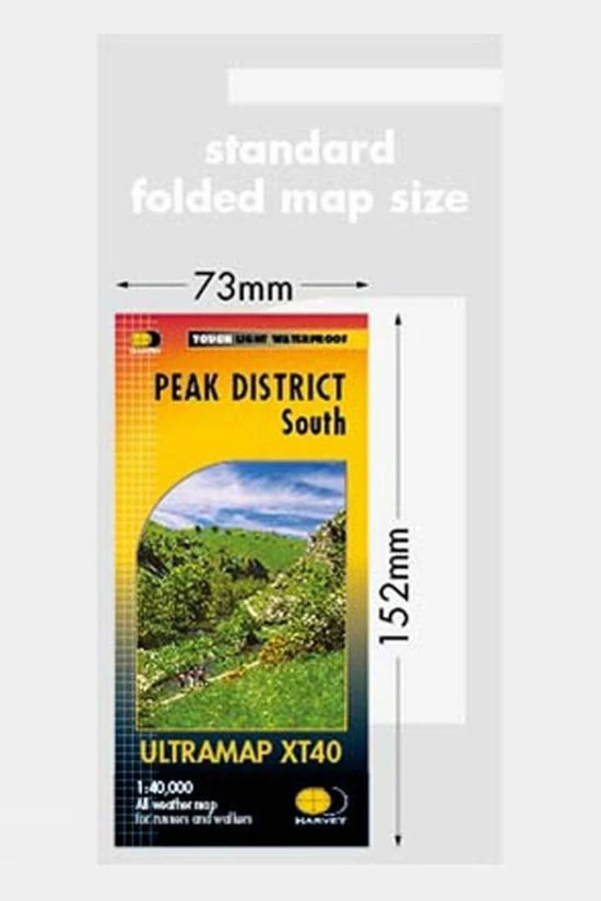 The Peak District South Ultra Map 1:40K from Harvey Maps. Has the advantages of its bigger brothers but is more pocketable. Fully detailed genuine HARVEY mapping. Use without a map case: tough and 100% waterproof. Opens directly to either side of the sheet