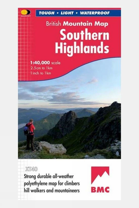 The Southern Highlands British Mountain Map 1:40K from Harvey Maps. Tough, light, durable and 100% waterproof. Genuine original HARVEY mapping. Includes Rights of Way. Tried and tested by the British Mountaineering Council and the Mountaineering Council of Scotland.