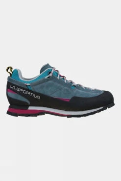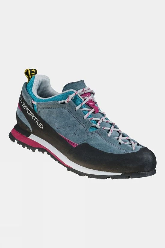 An approach shoe in the classic mould, the La Sportiva Women’s Boulder X Shoe is ideal for technical approaches, for easier routes, for via ferrata and for the walk-off. The ultra sticky Vibram sole with climbing zone make this model the ideal choice for technical approach routes and via ferrate. The improved sole design provides even greater grip while climbing and the Impact Brake System offers enhanced braking power for descent routes. The soft 2mm EVA insert guarantees optimum anti shock properties. The full rubber rand offers maximum protection against abrasion while climbing. The patented Asymmetric lacing system derives from the Mythos climbing shoe project and will ensure the perfect fit.