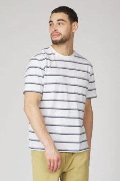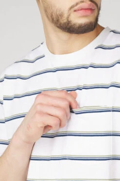 This classic striped T-shirt is crafted from a truly unique material. The yarn, better known as coffee yarn or Omnipotent KOFFIE, is spun from purified and reground coffee grounds. Not only does this material boast rapid drying properties, but it also provides natural protection against UV rays. When blended with organic cotton, the result is a lightweight and comfortable T-shirt that feels delightful to wear. Complete with a charming chest pocket for added flair.