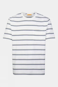This classic striped T-shirt is crafted from a truly unique material. The yarn, better known as coffee yarn or Omnipotent KOFFIE, is spun from purified and reground coffee grounds. Not only does this material boast rapid drying properties, but it also provides natural protection against UV rays. When blended with organic cotton, the result is a lightweight and comfortable T-shirt that feels delightful to wear. Complete with a charming chest pocket for added flair.