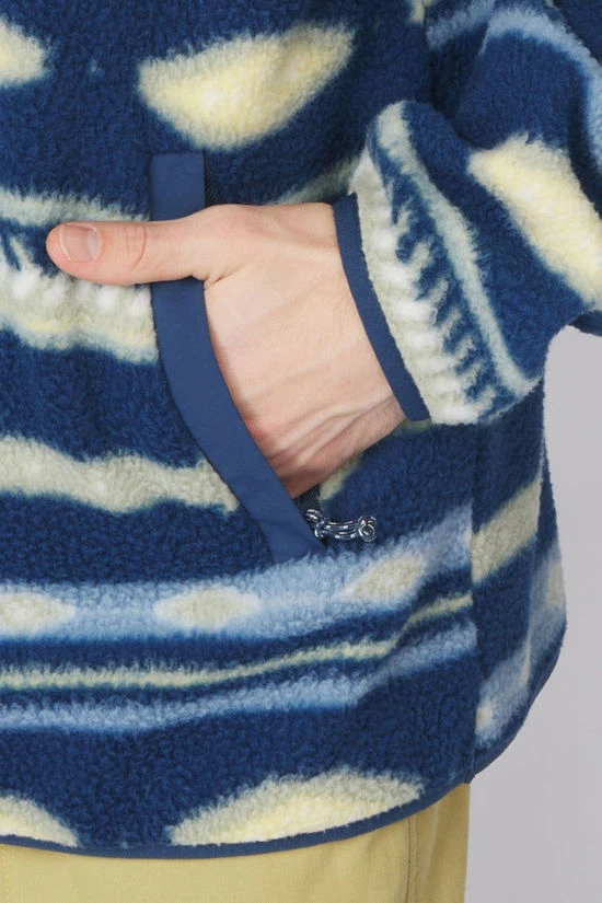 Gorpcore galore with this soft sherpa fleece featuring a vibrant retro print. Crafted from recycled polyester, this fleece jumper effortlessly blends style with functionality, insulation, and everyday comfort. The high collar and elasticated cuffs at the sleeves and hem ensure protection against the wind. Additionally, it features a practical half-zip and secure side pockets.