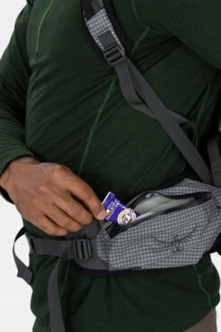 This backpack ensures easy access to your essentials. The PowerMesh front pocket proves to be a game-changer, offering a dedicated space for damp items like wet clothes, while the anti-scratch pocket provides a secure haven for your sunglasses. This top-loading pack features a hydration reservoir sleeve, dual zippered hip pockets and attachment points for ice axes and trekking poles. Designed for on-the-go access, the zipped pockets on each side of the lap belt provide swift entry to small items such as smartphones, energy bars, or GPS devices.