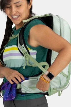 Additional storage includes a top panel zippered slash pocket, a LidLock bike helmet attachment, and lower side compression straps for securing your gear. There are also side stretch mesh pockets for quick-access items and an external hydration reservoir sleeve to keep water easily accessible. For more storage options, the Tempest 11 has an expandable stretch mesh harness pocket, dual-zippered fabric hipbelt pockets, and a blinker light attachment for added visibility. The large stretch mesh front panel pocket and adjustable bungee front panel storage provide even more space for extra gear or quick grabs.