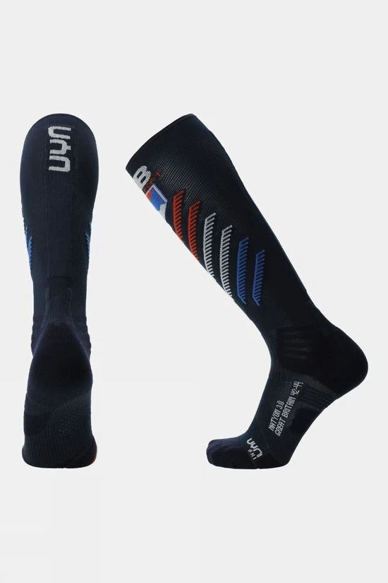 Elevate your skiing experience with the UYN Natyon 3.0 Socks, meticulously crafted for race performance and rigorously tested by top national ski teams. Engineered with cutting-edge Cool air flow technology, these socks boast a 3D micro channel structure that optimises air circulation, ensuring your feet stay dry and at an ideal temperature. The Target Compression Bandage, featuring a double section of asymmetrical bandage fabric with built-in breathability, provides targeted compression precisely where needed. Experience unmatched comfort in your ski boots with the innovative ZEROCUFF technology, eliminating calf elastic for improved blood circulation. Embrace peak performance on the slopes with these socks designed to enhance your every move, making them an essential companion for skiing enthusiasts and professionals alike.