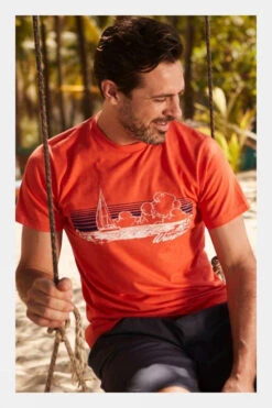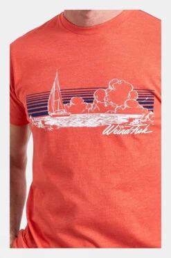 A scene we can picture ourselves in. The Horizon recycled polyester and organic cotton t-shirt features a graphic print of a sailing boat at sea. This graphic t-shirt features a flocking detail, a raised material with a felt like feel in the design, adding uniqueness to this tee.