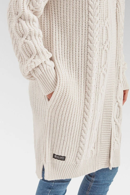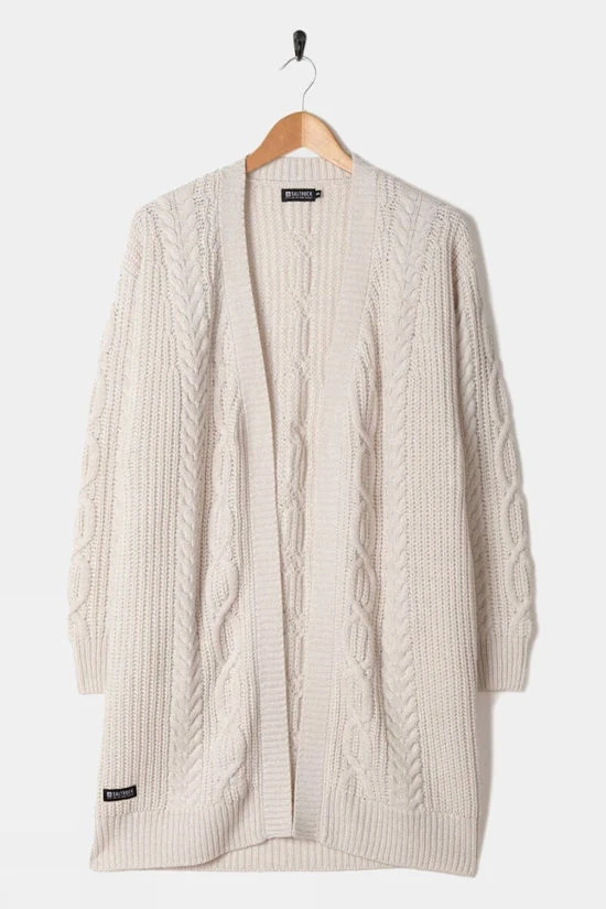 The casual open-front silhouette creates an effortlessly relaxed look, while the longline length and split hem offer flattering coverage. Practicality meets style with two discreet side pockets, cleverly integrated into the seams to keep your essentials close without disrupting the cardigan’s sleek appearance. A subtle nod to Saltrock’s adventurous spirit, the metal Flamehead tab on the hem adds a touch of distinctive branding that reflects premium quality. Whether layered over your favourite activewear or paired with jeans for a laid-back look, the Saltrock Cable Knitted Cardigan is the versatile staple your wardrobe has been missing. Designed to keep you snug and stylish, it’s perfect for those who value comfort without compromising on performance.