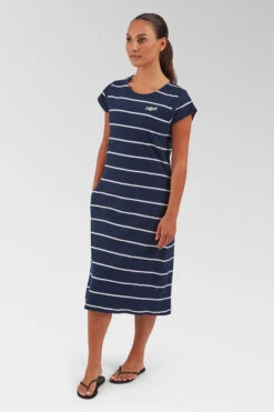 The embroidered Saltrock branding on the chest adds a subtle yet distinctive touch of branding, while the short sleeves and crew neckline provide a classic silhouette. Falling below the knee in length, this dress is perfect for casual outings or relaxed days, effortlessly combining comfort and elegance in one ensemble.